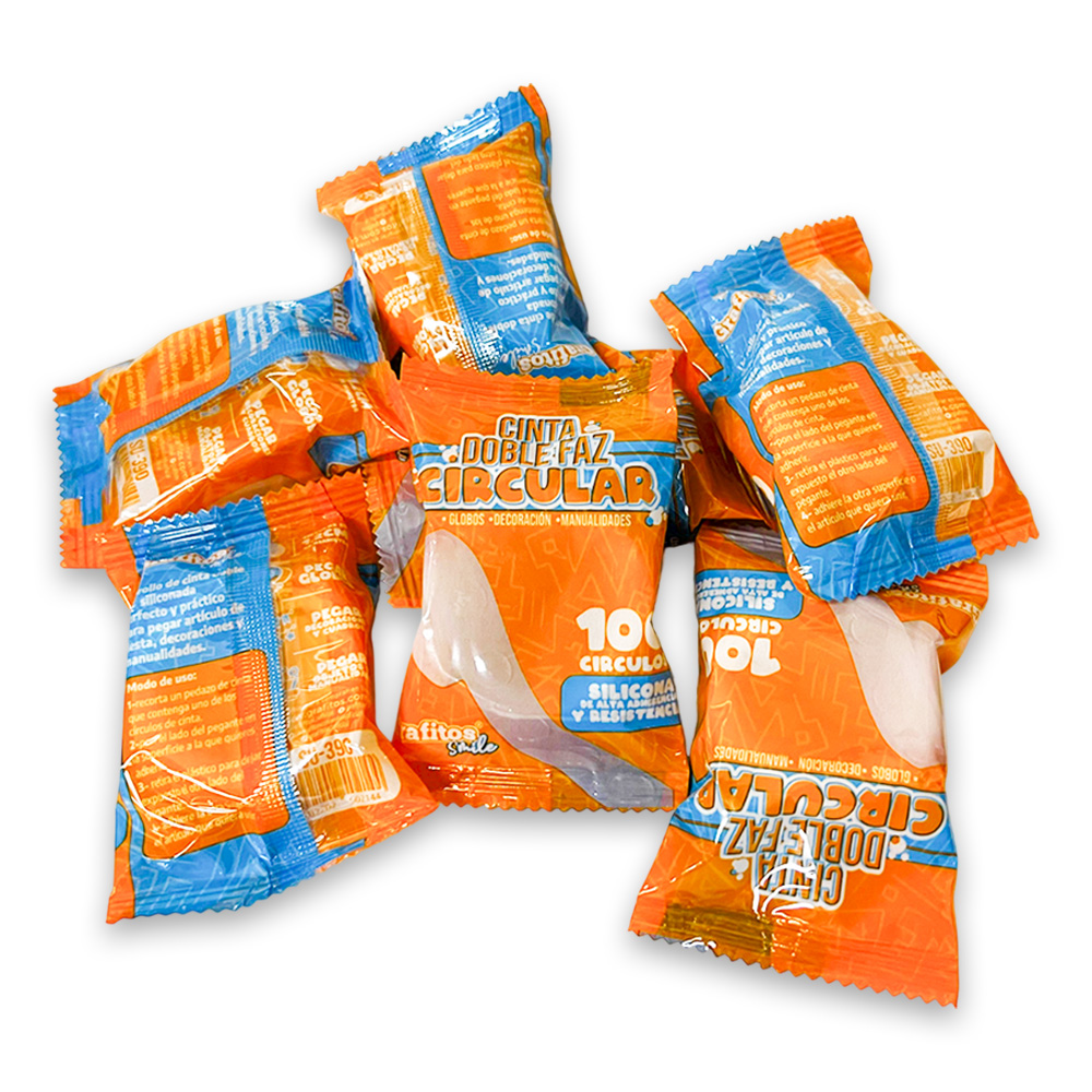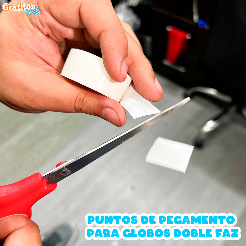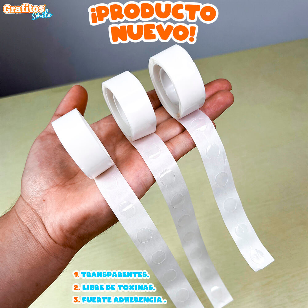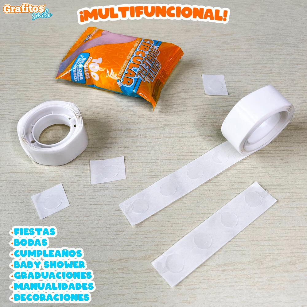 Su formato en puntos circulares precortados facilita la aplicación, eliminando la necesidad de cortar o manipular cinta tradicional. Es perfecta para pegar globos, decoraciones, sobres, cuadros livianos, carteles, manualidades y más.