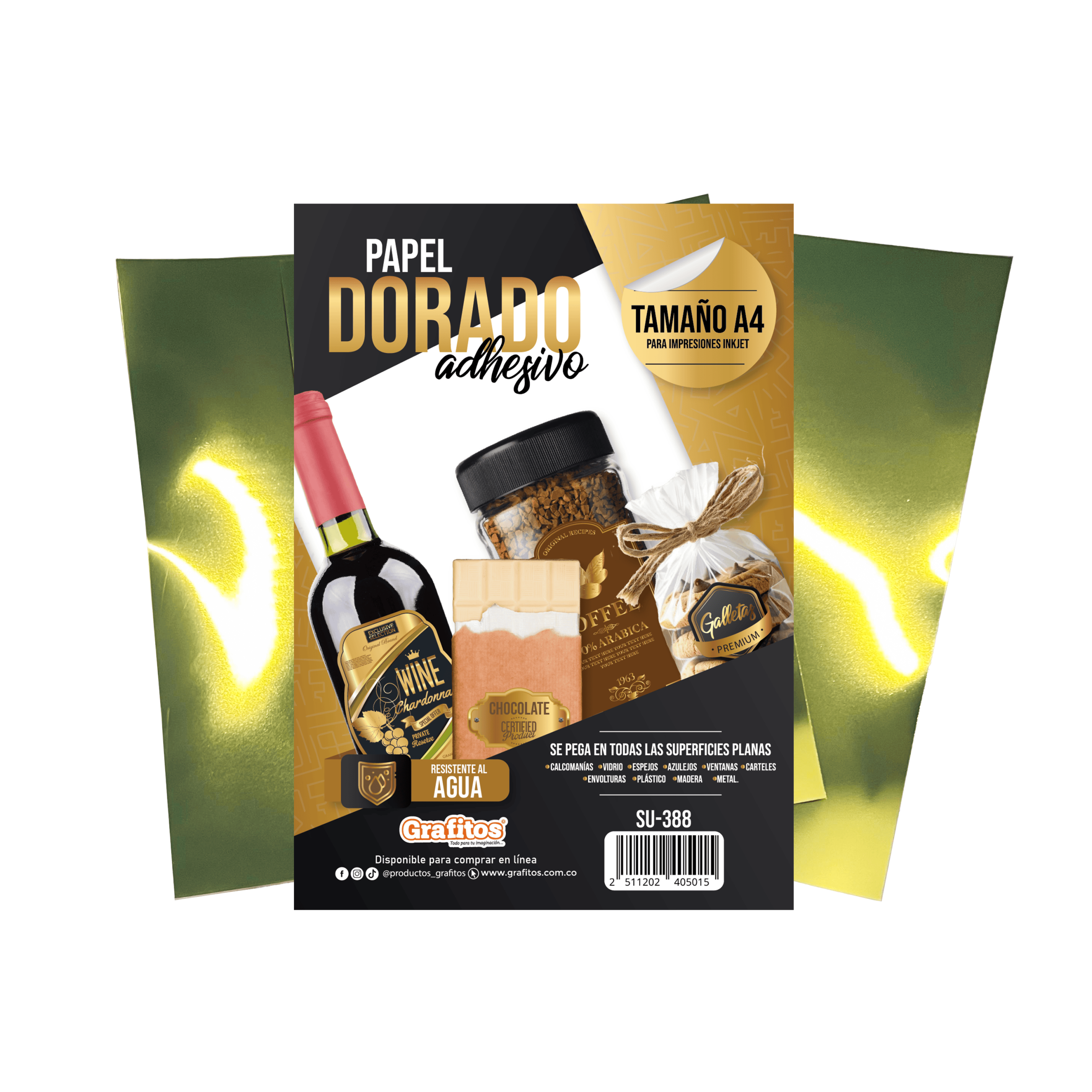 Si buscas un acabado sofisticado y llamativo, el Papel Dorado Adhesivo A4 Grafitos SU-388 es la elección ideal. Su brillo metálico y tono dorado añaden distinción y glamour a etiquetas, empaques y manualidades, convirtiendo cualquier proyecto en una verdadera obra de arte.