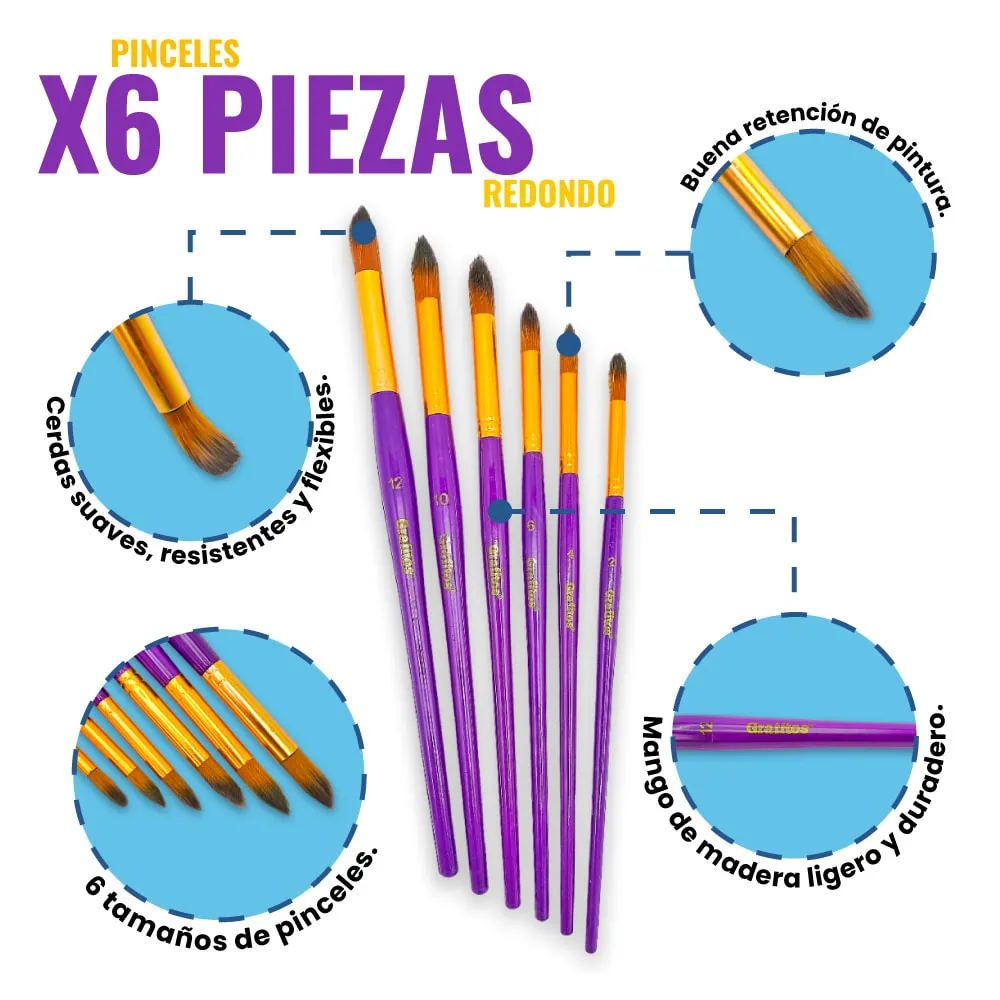 Cada set incluye 6 tamaños diferentes, ideales para detalles finos o trazos amplios. Sus cerdas suaves y flexibles garantizan un trazo preciso, adaptándose a cualquier técnica artística, brindando un acabado profesional en cada pincelada.
