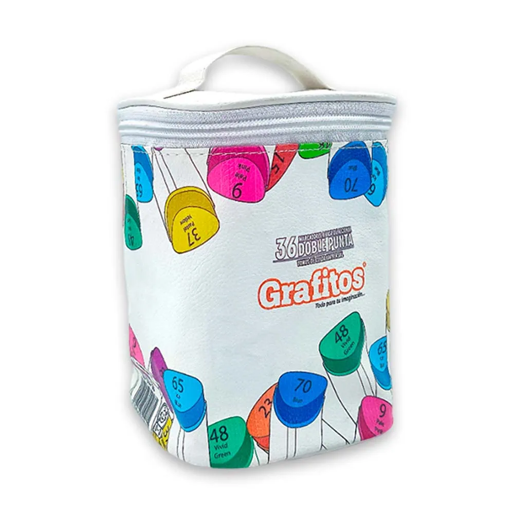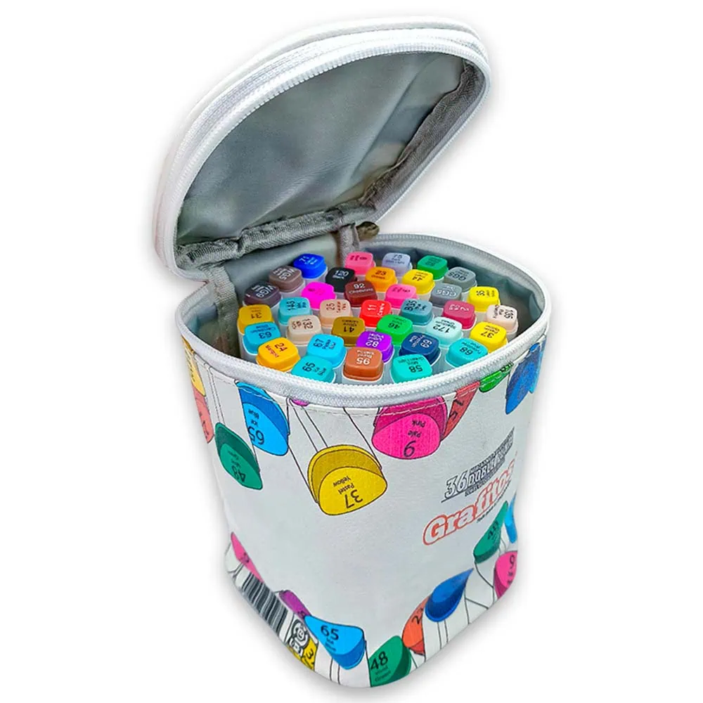 El estuche, elaborado en cuerina de alta calidad, es tanto práctico como estiloso. Con un cierre seguro y una manija para un transporte sencillo, podrás llevar tu kit de arte a cualquier lugar. ¡Deja que tu creatividad brille con el Set de 36 Marcadores!