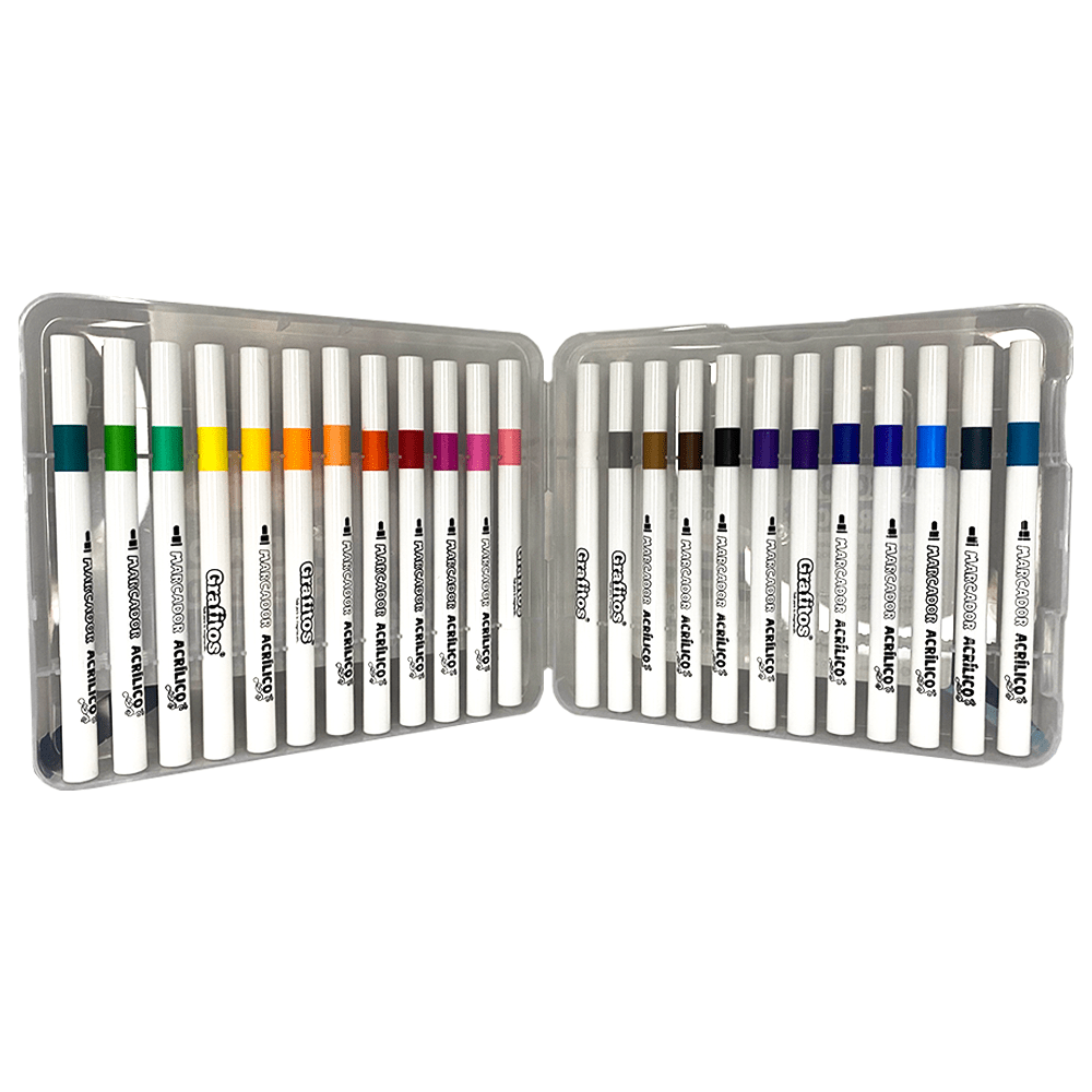 El estuche de marcadores acrílicos de 24 unidades es una opción imprescindible para artistas y creativos. Estos marcadores son ideales para una amplia variedad de superficies, como cerámica, vidrio, plástico y papel, lo que los convierte en una herramienta versátil para tus proyectos artísticos. Los marcadores acrílicos destacan por sus colores intensos y vibrantes, que incluyen colores como verde, verde biche, amarillo, rosado, naranja, rojo, blanco, celeste, marrón, morado, azul oscuro, negro y muchos mas. Estos tonos permiten una expresión artística impactante y detallada, brindándote la posibilidad de crear obras visualmente sorprendentes.