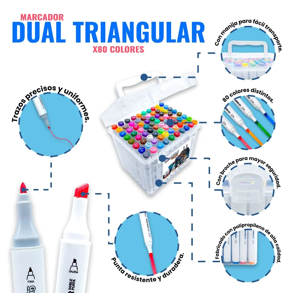 Para estudiantes, artistas y profesionales, los Marcadores Dual Triangular x80 son la combinación perfecta de calidad y estilo. ¡Deja que cada trazo refleje tu creatividad y explora un mundo de color sin fin!