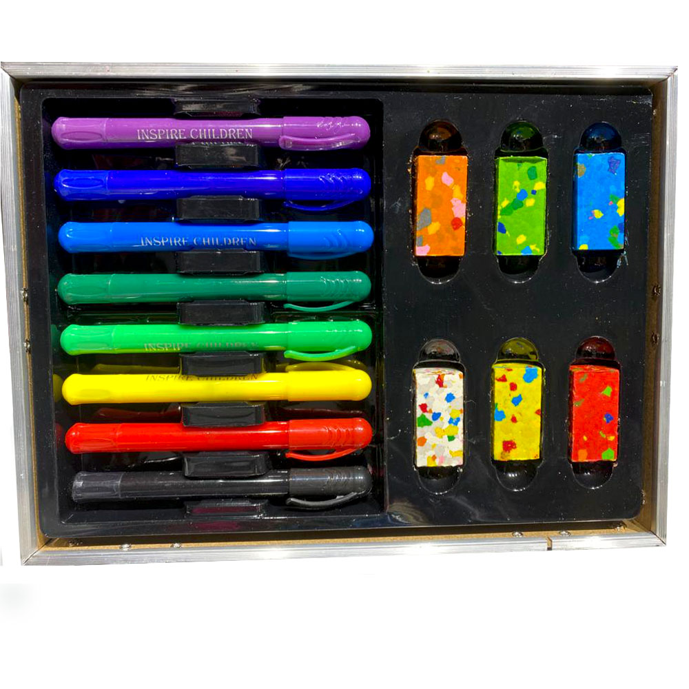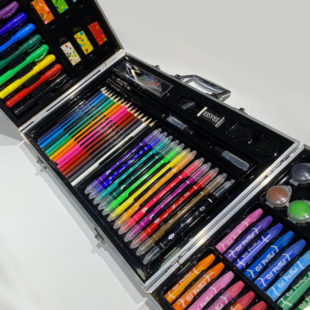 El set también incluye una variedad de herramientas de escritura, como un borrador blanco, sacapuntas, lápiz y regla, así como un pincel para las acuarelas. Todo esto viene en un estuche metálico con estuche interno plástico para organizar cada pieza y mantenerlas seguras y protegidas. Es fácil de transportar gracias a su aza y cierres seguros.