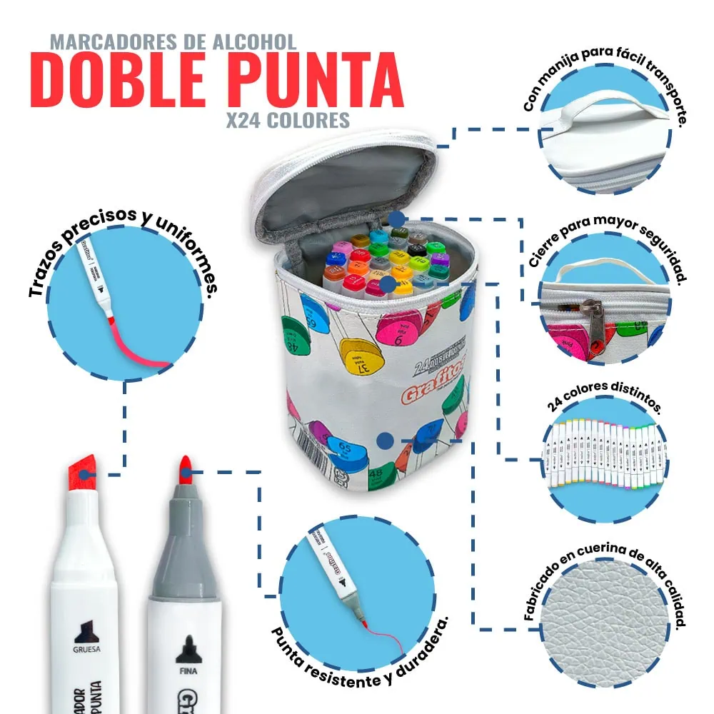 Descubre el Set de 24 Marcadores a Base de Alcohol con doble punta, perfectos para artistas y creadores. Con una punta resistente y duradera, estos marcadores ofrecen trazos precisos y uniformes, ideales para cualquier técnica artística.