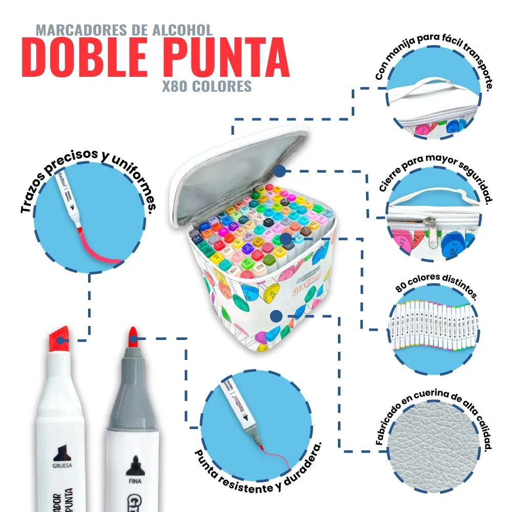 Te presentamos el Set de 80 Marcadores a Base de Alcohol con doble punta, diseñado para dar vida a tus ideas más ambiciosas. Con una punta fuerte y duradera, estos marcadores proporcionan trazos uniformes y precisos, perfectos para cualquier tipo de obra artística.