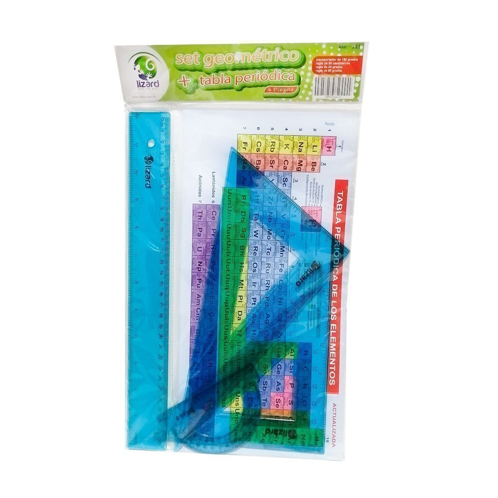 Además de la tabla periódica, el set contiene varias herramientas geométricas esenciales. Entre ellas se encuentran las escuadras, que son instrumentos utilizados para trazar ángulos rectos y otras figuras geométricas. Con las escuadras, podrás construir triángulos, cuadrados y rectángulos con precisión.