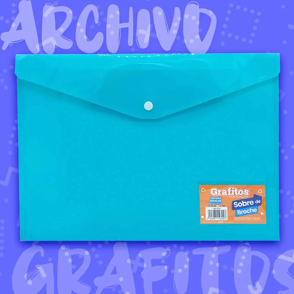 El Sobre de Broche Oficio Grafitos es la solución perfecta para mantener tus documentos importantes organizados y protegidos. Fabricado en plástico resistente, asegura la durabilidad necesaria para un uso prolongado, mientras que su broche de cierre ofrece seguridad y facilidad de acceso a su contenido.