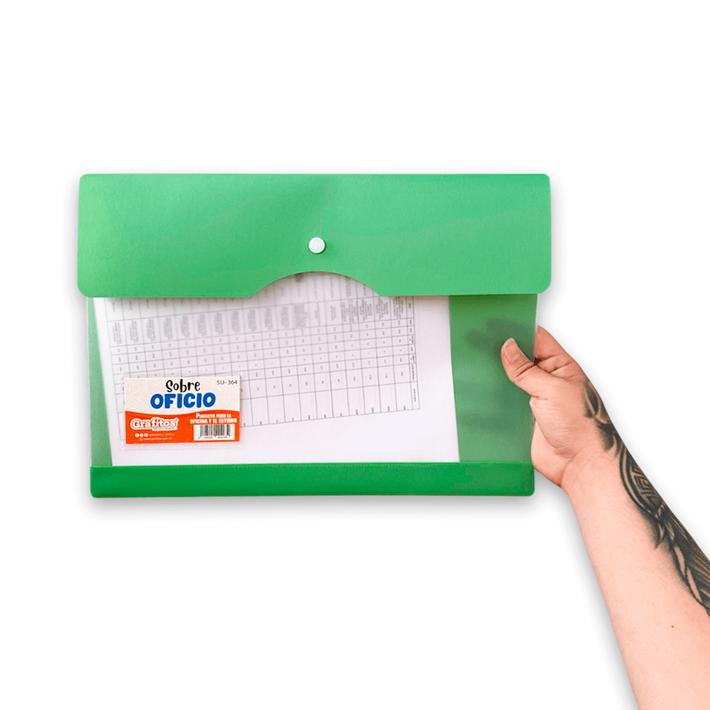 El sobre está fabricado con materiales de alta calidad que protegen su contenido de dobleces, suciedad y rasgaduras. Su práctico cierre de broche asegura que los papeles permanezcan bien resguardados y en su lugar, evitando extravíos o desorden. Además, su diseño versátil se adapta a diferentes necesidades, convirtiéndolo en una herramienta imprescindible para estudiantes y profesionales.